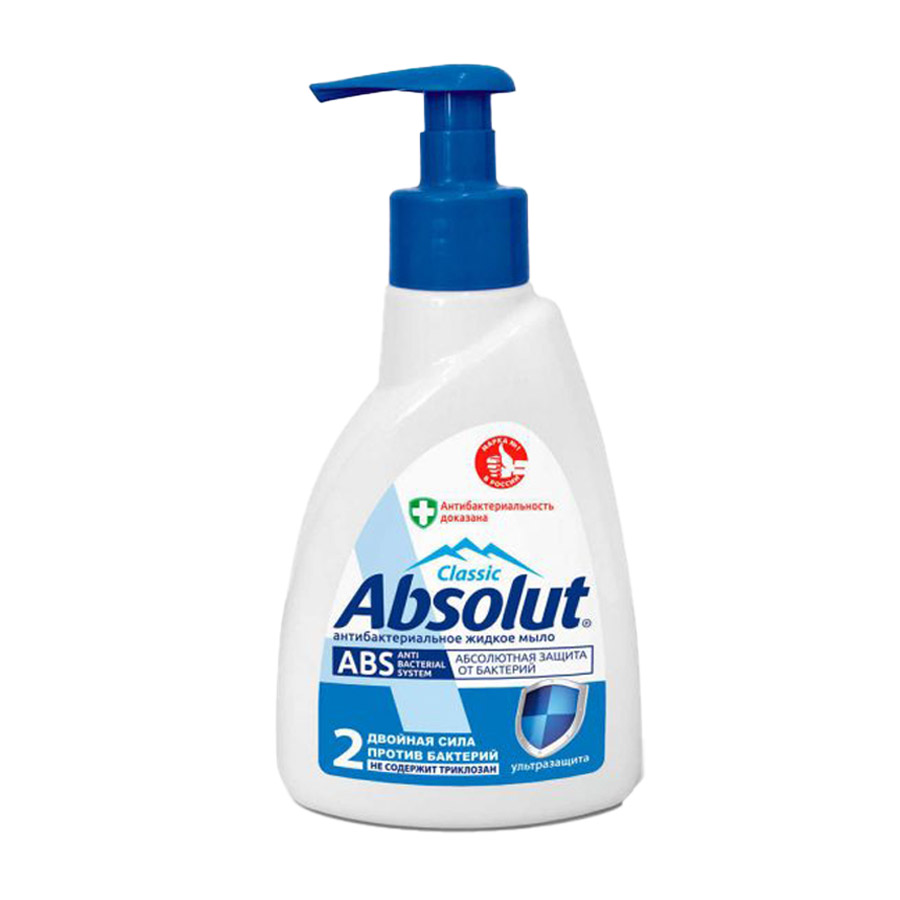 Антибактериальное жидкое мыло Absolut «ABS Ультразащита». Первое мыло с инновационным антибактериальным комплексом. Абсолютное преимущество. Абсолютная защита от бактерий. Двойная сила против бактерий.