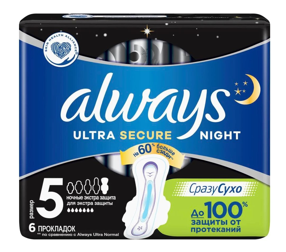 Always Ultra Night (Размер 5) с системой InstantDry мгновенно впитывают влагу и удерживают ее внутри, обеспечивая до 100% защиты и уверенности. Always Ultra оснащены технологией нейтрализации запаха, которая блокирует неприятный запах, а не просто маскирует его. Always Ultra толщиной всего 3 мм дарят комфорт и обеспечивают непревзойденную защиту во время менструации. Always Ultra Secure Night (Размер 5) имеют удлиненную на 60% заднюю часть. Благодаря этому они обеспечивают еще лучшую защиту от протеканий. Созданы специально для защиты в ночное время. Always Ultra имеют защитные контуры SecureGuard и содержат гель, который впитывает и удерживает влагу, помогая предотвращать протекания.