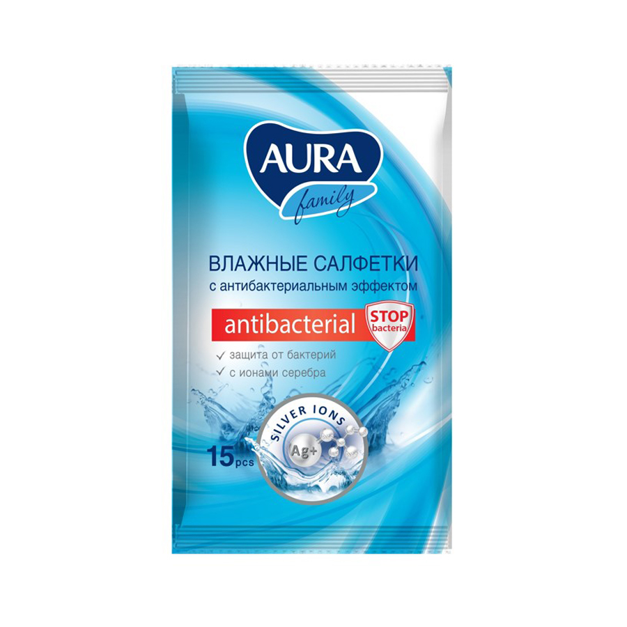 AURA FAMILY Влажные салфетки c антибактериальным эффектом 15шт