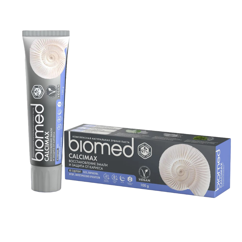 Зубная паста BIOMED «Кальцимакс» – укрепление и реминерализация эмали. Клинически доказанный эффект очищения за 30сек. Рекомендована для всей семьи: детям от 6 лет и взрослым. Натуральность подтверждена в системе добровольной сертификации Biorus. Не содержит: sles, парабены, фтор, синтетические ароматизаторы и красители.