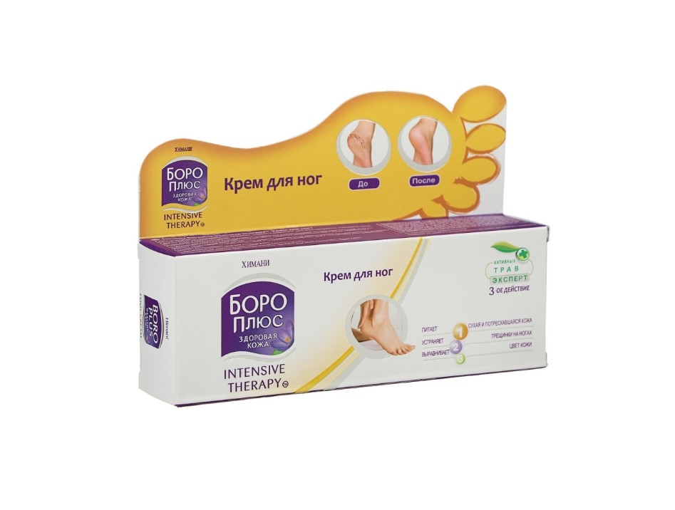 Успокаивает и увлажняет сухую кожу ступней и пяток. Крем Боро Плюс прекрасно подходит для всей семьи. Проникая глубоко вглубь, состав крема с революционным натуральным комплексом, великолепно защищает, восстанавливает и регенерирует кожу, придаёт ей более здоровый и природный вид. Специально разработанная формула средства с комплексным составом трав, способна в скорые сроки устранить сухость и трещины на пятках, оставляя после себя ощущение мягкости, свежести и комфорта. Активно питательные травы с высоким антисептическим действием идеальны для любой по типу кожи. Масло мускатного ореха с великолепно увлажняющим действием, быстро и эффективно справляется с потрескавшейся кожей на стопах. Натуральный экстракт ромашки хорошо увлажняет, останавливает шелушение, устраняет омертвевшие частицы. Ним, как высокодейственный антисептик, предотвращает образование трещин и инфекций.