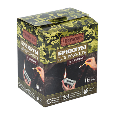 Размер: 10,5 х 9,5 х 13 см Размер пакета: 14 х 4 х 1 см Брикеты для розжига в пакетах BOYSCOUT отлично подходят для быстрого разведения огня. Они изготовлены из растительных материалов, не наносят вред окружающей среде, не выделяют паров и запаха, что позволяет не менять вкус приготавливаемой пищи. Для розжига нужно просто положить пакет в дрова или угли и поджечь уголок. Нет неоходимости вскрывать пакет и доставать брикет - это предотвращает загрязнение рук.