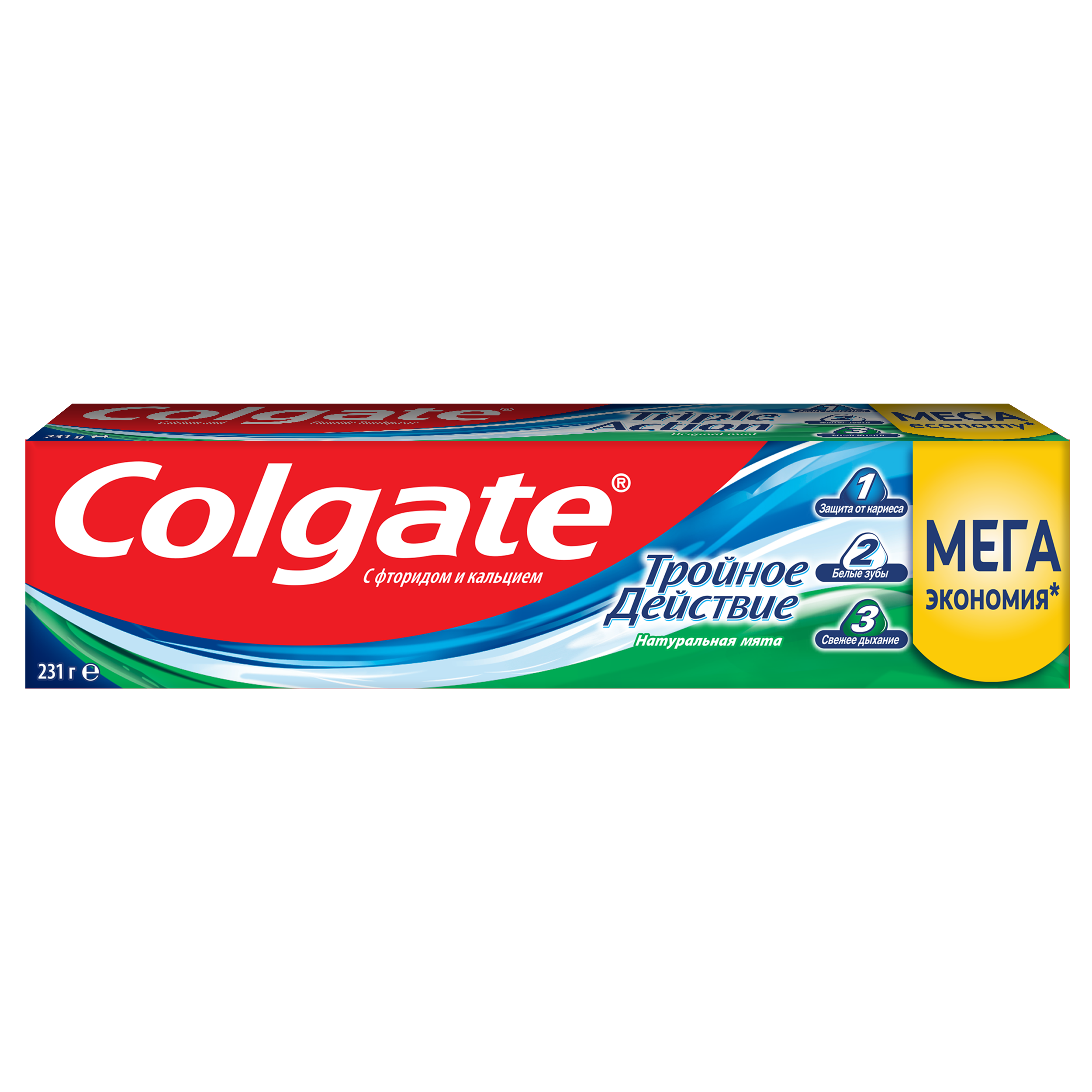 Зубная паста Colgate Тройное Действие обеспечивает максимальную защиту от кариеса. Эта трехцветная зубная паста оказывает тройное действие: Помогает защищать полость рта от бактерий; Помогает сделать зубы белее и устраняет желтизну зубов; Освежает дыхание.