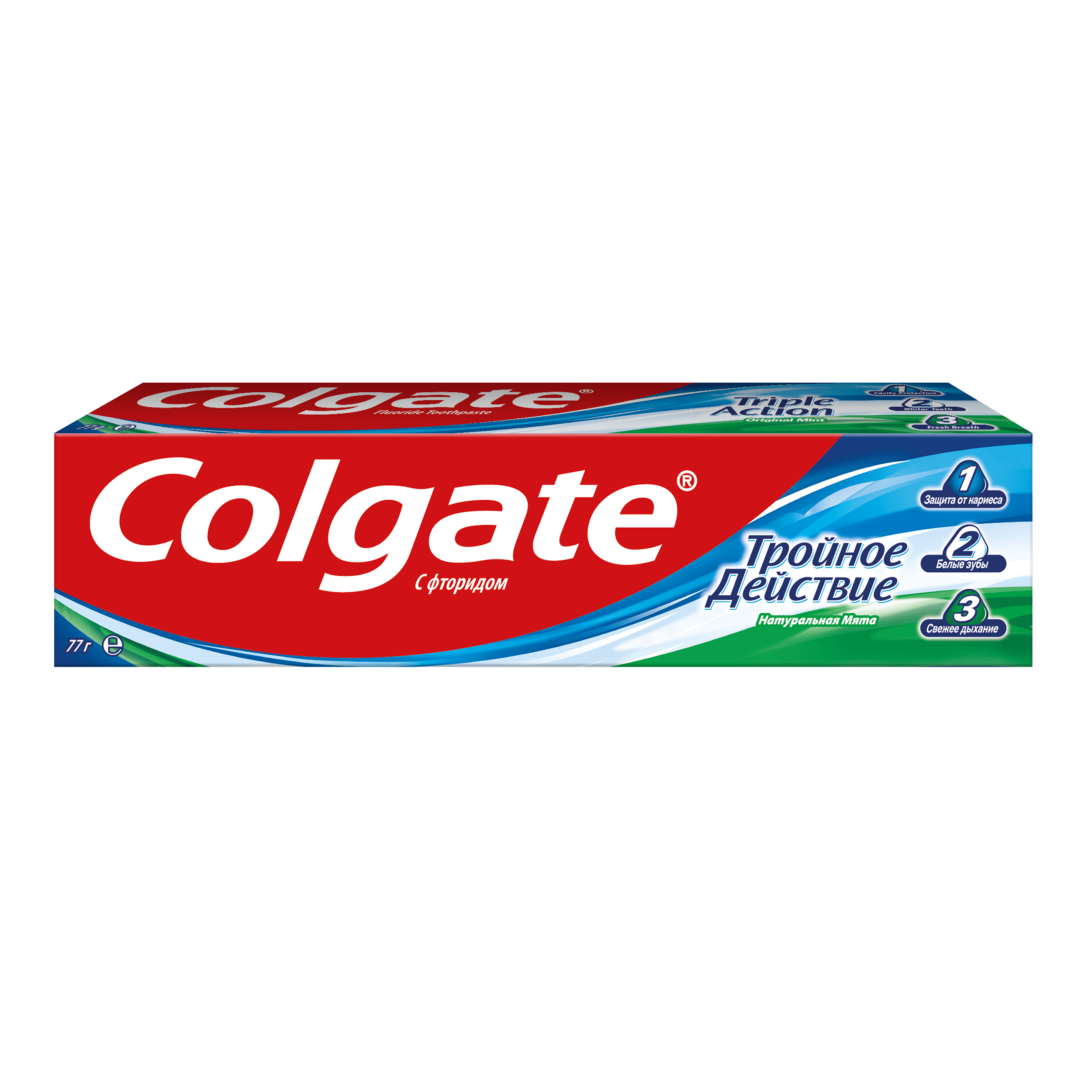 Зубная паста Colgate Тройное Действие обеспечивает максимальную защиту от кариеса. Эта трехцветная зубная паста оказывает тройное действие: Помогает защищать полость рта от бактерий; Помогает сделать зубы белее и устраняет желтизну зубов; Освежает дыхание.