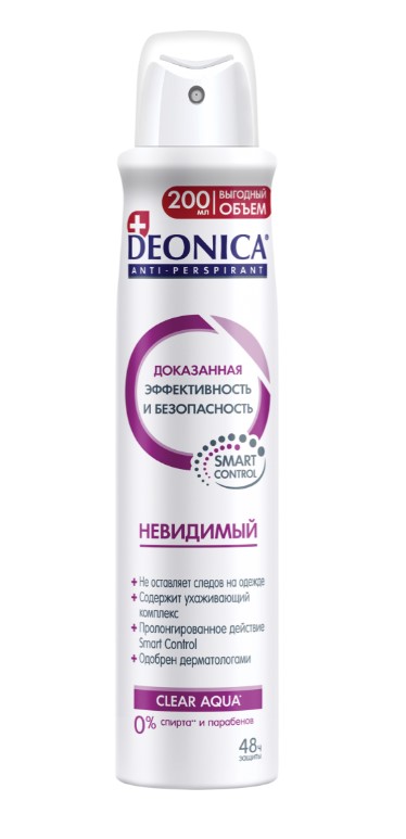 Уникальный антиперспирант DEONICA НЕВИДИМЫЙ благодаря специальной формуле не оставляет следов и пятен на черной, белой и цветной одежде и обеспечивает надежную защиту от пота и запаха на 48 часов.Интеллектуальная технология SMART CONTROL с активными капсулами свежести пролонгирует действие антиперспиранта.Не оставляет следов на белой, черной и цветной одежде.Содержит ухаживающий комплекс.Технология Smart Control с активными капсулами свежести пролонгирует действие антиперспиранта.Одобрен дерматологами.0% спирта и парабенов.