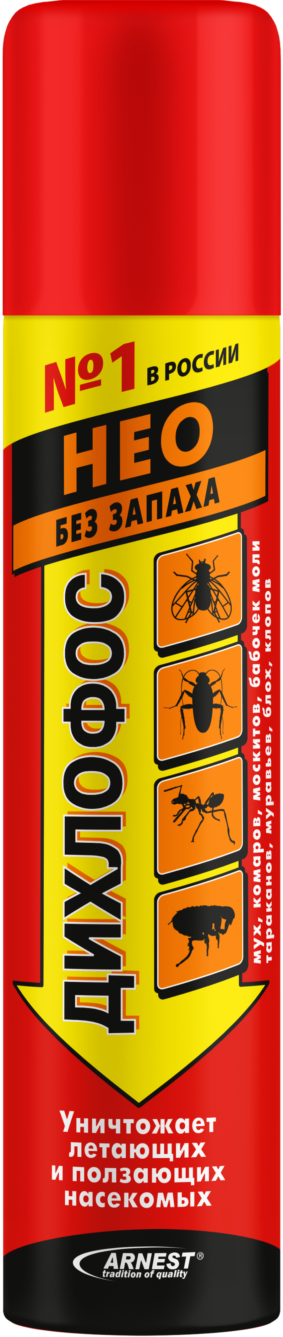 Незаменимое в домашнем хозяйстве универсальное средство для борьбы со всеми видами бытовых насекомых. Уничтожает мух, комаров, тараканов, муравьёв, бабочек моли, клопов, блох и других насекомых. Не имеет запаха. Создаёт защитный барьер на обработанных поверхностях, действующий до 2-х недель. В составе современного Дихлофоса - сочетание трёх современных действующих веществ, усиленное специальным веществом-синергистом. Не оставляет насекомым шанса выжить.