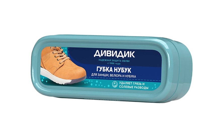 Губка для обуви ДИВИДИК 1шт НУБУК. Специальный пористый материал, из которого изготовлена губка, служит для бережной очистки и ухода за изделиями из замши, велюра и нубука.Удаляет пыль, грязь, солевые разводы и залоснившиеся пятна.Бережно поднимает ворс.Восстанавливает первоначальный внешний вид обуви.