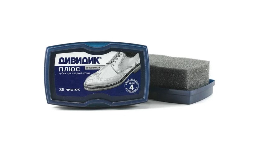 Губка для обуви "Дивидик Плюс" бесцветная очищает, обновляет цвет, придает естественный блеск изделиям из гладкой кожи. Обеспечивает до 35 качественных чисток. Пропитка в губке распределяется точечным образом в концентрированном виде. Нет жирности при первой чистке, экономичный расход вещества.