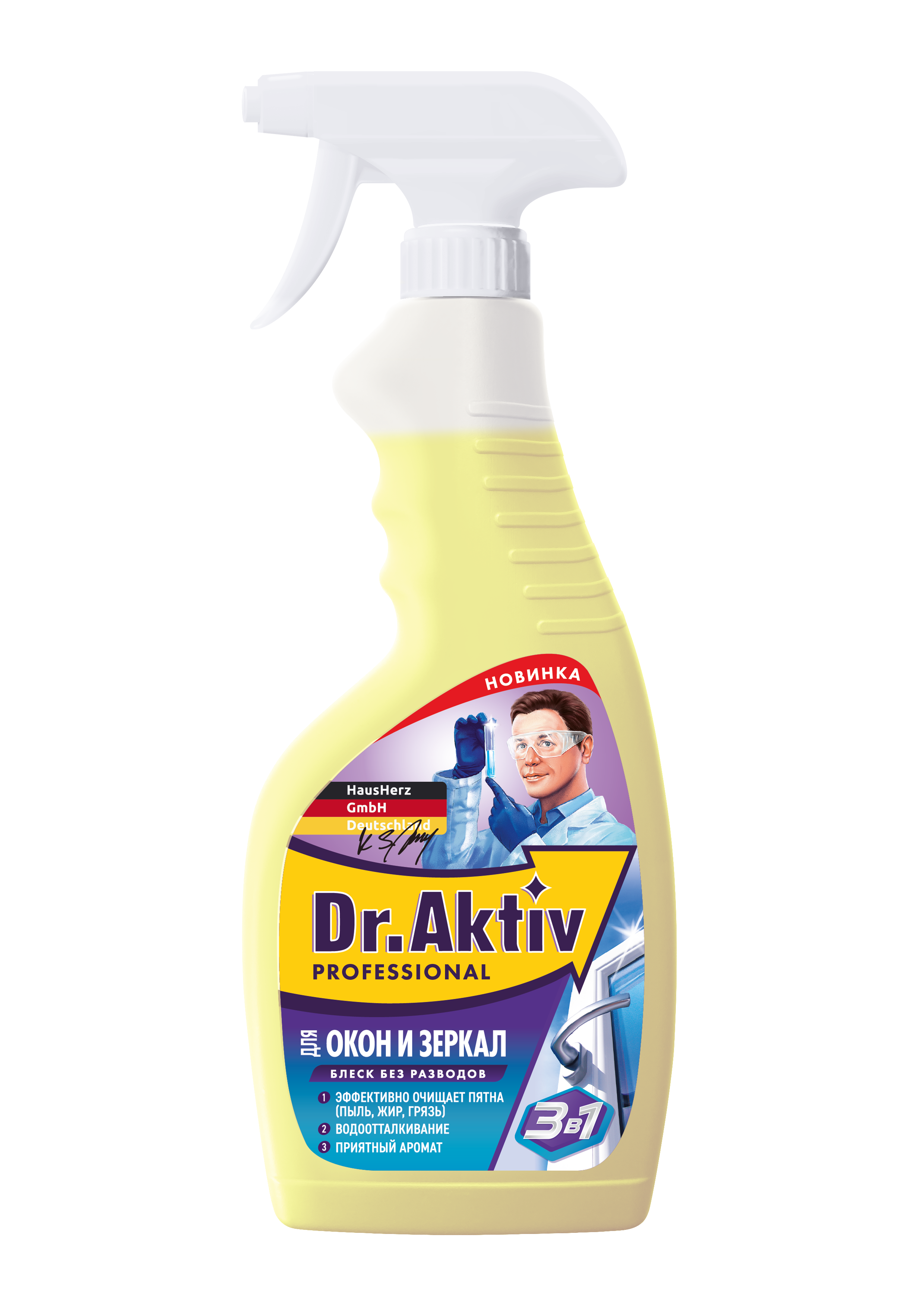 Средство для мытья окон, зеркал и стеклянных поверхностей. Эксперт профессионального клининга Dr.Aktiv предлагает вам средство для домашнего использования с профессиональной формулой: Средство для мытья окон и зеркал Dr.Aktiv с ароматом «Лимонная свежесть». Активная формула с нашатырным спиртом быстро и эффективно удаляет сложные загрязнения, жир, пыль, следы насекомых. Функциональная добавка обеспечивает защиту поверхности, создаёт эффект быстрого высыхания без пятен и разводов, придаёт блеск, обладает грязезащитной и водоотталкивающей функциями. Сбалансированное сочетание компонентов облегчает повторную очистку и обеспечивает долговременную чистоту. Подходит для окон, стёкол, зеркал и других видов водостойких материалов и покрытий, кроме деревянных лакированных.