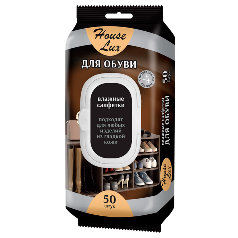 Влажные салфетки для обуви HOUSE LUX - вытирают с обуви грязь и пыль. Полезно, если по дороге на работу вы испачкали туфли: можно быстро вытереть их в любом месте. Салфетки удобно брать в поездки. С натуральным воском: защищают от влаги, придают блеск. Упаковка с клапаном: салфетки легко доставать. В упаковке 50 салфеток - одному человеку хватает на месяц. Подходят для обуви из гладкой кожи. Не убирают въевшиеся загрязнения - для этого используйте специальные средства.