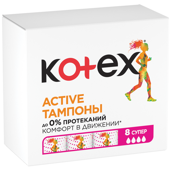 Тампоны Kotex® Active Супер – это больше, чем просто защита, в дни обильных менструальных выделений! Благодаря дополнительным разнонаправленным желобкам и голубой линии защиты новые тампоны Котекс® Active быстро впитывают жидкость, защищают под любым углом и обеспечивают ДО 0% ПРОТЕКАНИЙ и КОМФОРТ В ДВИЖЕНИИ1! Каждый тампон в индивидуальной упаковке – удобно брать с собой. Основные преимущества: вдвое больше желобков2; тонкий кончик и шелковистое покрытие Silky Cover, которое обеспечивает максимально комфортное введение благодаря; специальная голубая линия из гидрофильных волокон ULTRA SORB3; тампоны двигаются вместе с тобой и защищают под любым углом благодаря технологии FlexFitTM.