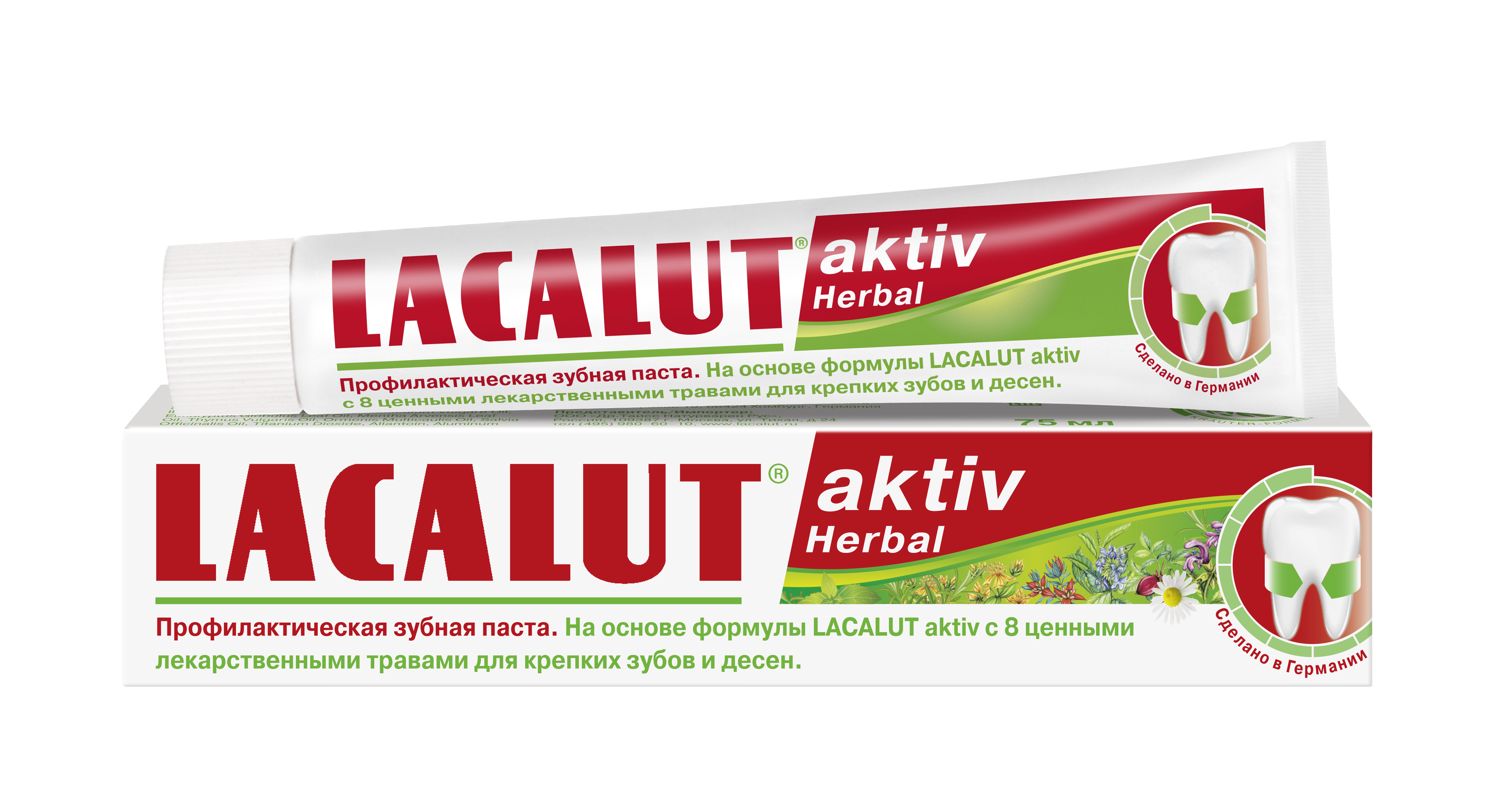 Зубная паста LACALUT® aktiv Herbal с лактатом алюминия и 9 лекарственными травами укрепляет десны, оказывает вяжущий и противовоспалительный эффект, предупреждает развитие пародонтита и кровоточивости.Входящий в состав фторид натрия обеспечивает профилактику кариеса. Комбинация из 9 экстрактов и эфирных масел лекарственных растений (мирра, эвкалипт, шалфей, ромашка, мята, тимьян, фенхель, анис, розмарин) комплексно заботится о здоровье полости рта и обеспечивает свежее дыхание надолго. Содержит 94,5% натуральных ингредиентов.