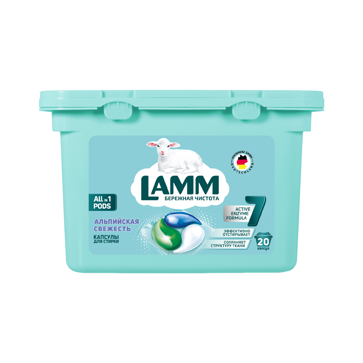 Капсулы для стирки «LAMM Альпийская свежесть» All in 1 с пониженным пенообразованием с биодобавками эффективно и бережно отстирывают белые и светлые изделия из хлопчатобумажных, льняных и синтетических тканей, а также тканей из смешанных волокон в стиральных машинах любого типа.