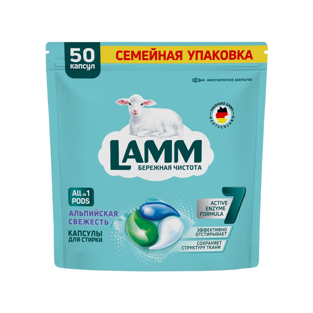 Капсулы для стирки «LAMM Альпийская свежесть» All in 1 с пониженным пенообразованием с биодобавками эффективно и бережно отстирывают белые и светлые изделия из хлопчатобумажных, льняных и синтетических тканей, а также тканей из смешанных волокон в стиральных машинах любого типа.