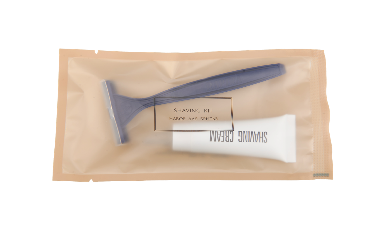 Одноразовый бритвенный набор в матовом двухцветном пакете с насечкой Marrone. В набор входит одноразовая пластиковая бритва с двумя лезвиями и увлажняющей полоской и крем для бритья в тубе 10 гр.