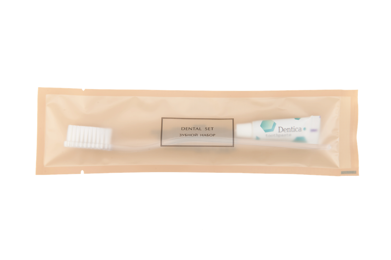 В набор входит зубная щетка средней жесткости (длина 18 см) и зубная паста с ментоловым ароматом в тубе 4 гр. По желанию заказчика зубная щетка может быть заменена на другую по характеристикам ( мягче или меньше). Это будет влиять на стоимость набора.