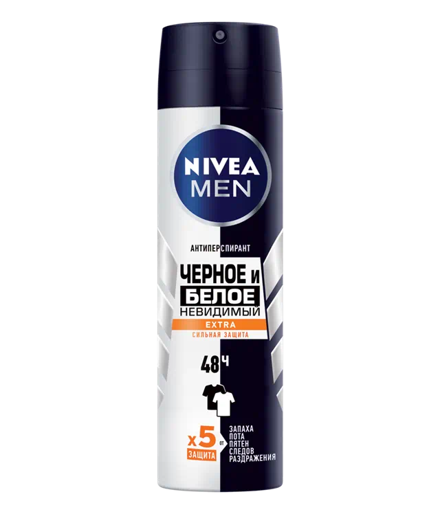 Дезодорант-антиперспирант спрей NIVEA Черное и Белое Невидимый Extra предотвращает появление белых пятен на темной одежде и желтых пятен на светлой одежде. Черная одежда остается черной, а белая одежда дольше остается белой. Уникальная формула имеет 5 факторов защиты: от запаха, пота, пятен, следов и раздражения. Защищает кожу подмышек в течение 48 часов от пота и неприятного запаха. Этот чистый, кристальный и яркий сладковатый аромат - выражение естественной женственности. Не содержит этилового спирта. Сильная защита и забота о коже от Nivea на каждый день.