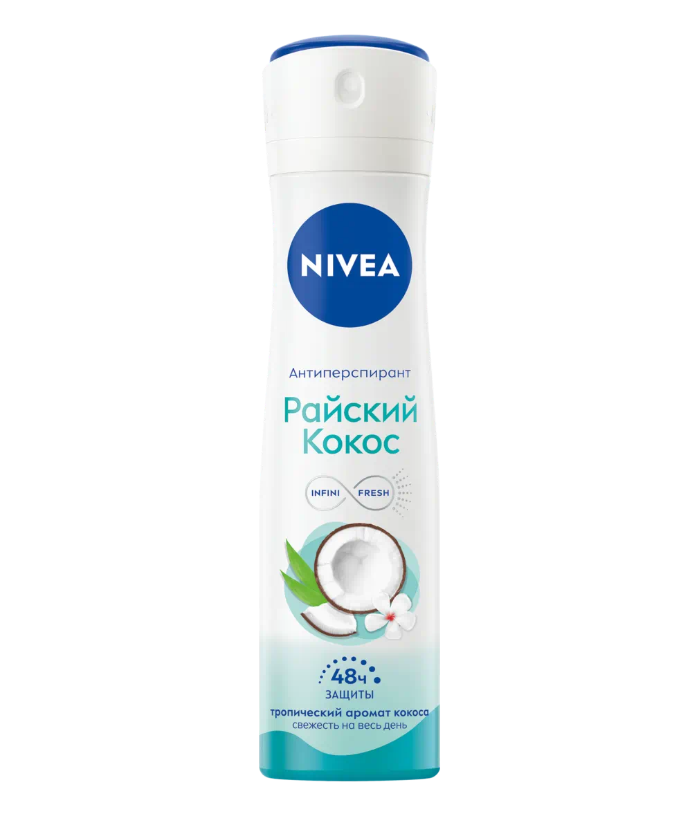Испытай длительную свежесть и сладкий аромат спелого кокоса с NIVEA Райский кокос. Антиперспирант быстро высыхает и обеспечивает надёжную защиту на 48 часов.Секрет заложен в уникальной формуле NIVEA ∞ INFINIFRESH: Антибактериальный эффект не только маскирует неприятный запах, но и активно борется с бактериями до возникновения неприятного запаха. Не содержит этилового спирта.