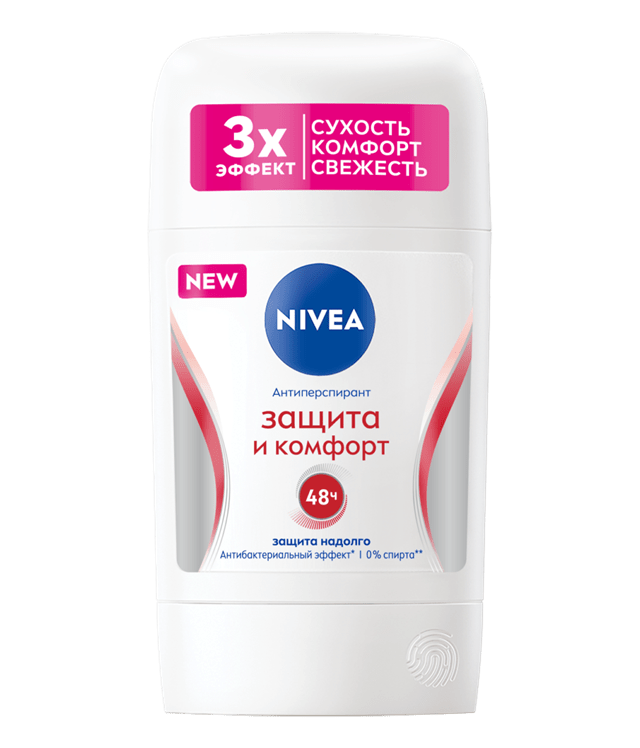 Антиперспирант-стик с новой эмульсионной техологией на 48 часов бережно защищает кожу подмышек. Обеспечивает чувство свежей и чистой кожи: антиперспирант-стик NIVEA ЗАЩИТА И КОМФОРТ.