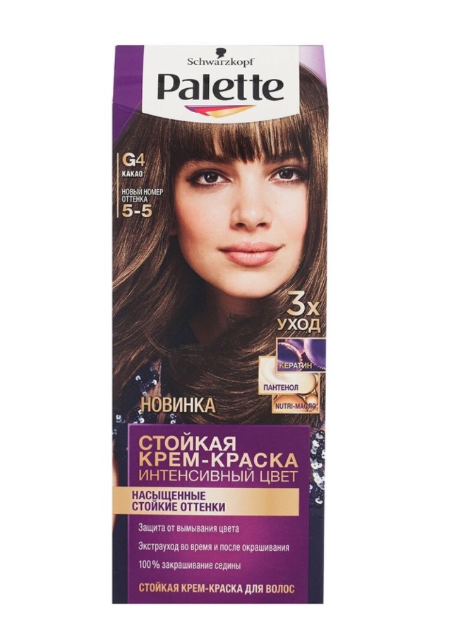 Формула с высокоинтенсивными пигментами проникает глубоко внутрь волоса, защищая цвет от вымывания. Стойкий насыщенный цвет надолго и 100% закрашивание седины. Формула и маска-уход с тройной системой ухода с кератином, пантенолом и nutri-маслом обеспечивают бережную заботу о волосах. Palette укрепляет, разглаживает волокна волос и наполняет их цветом для роскошного стойкого оттенка. • Защита от вымывания цвета. • Экстрауход во время и после окрашивания. • 100% закрашивание седины.