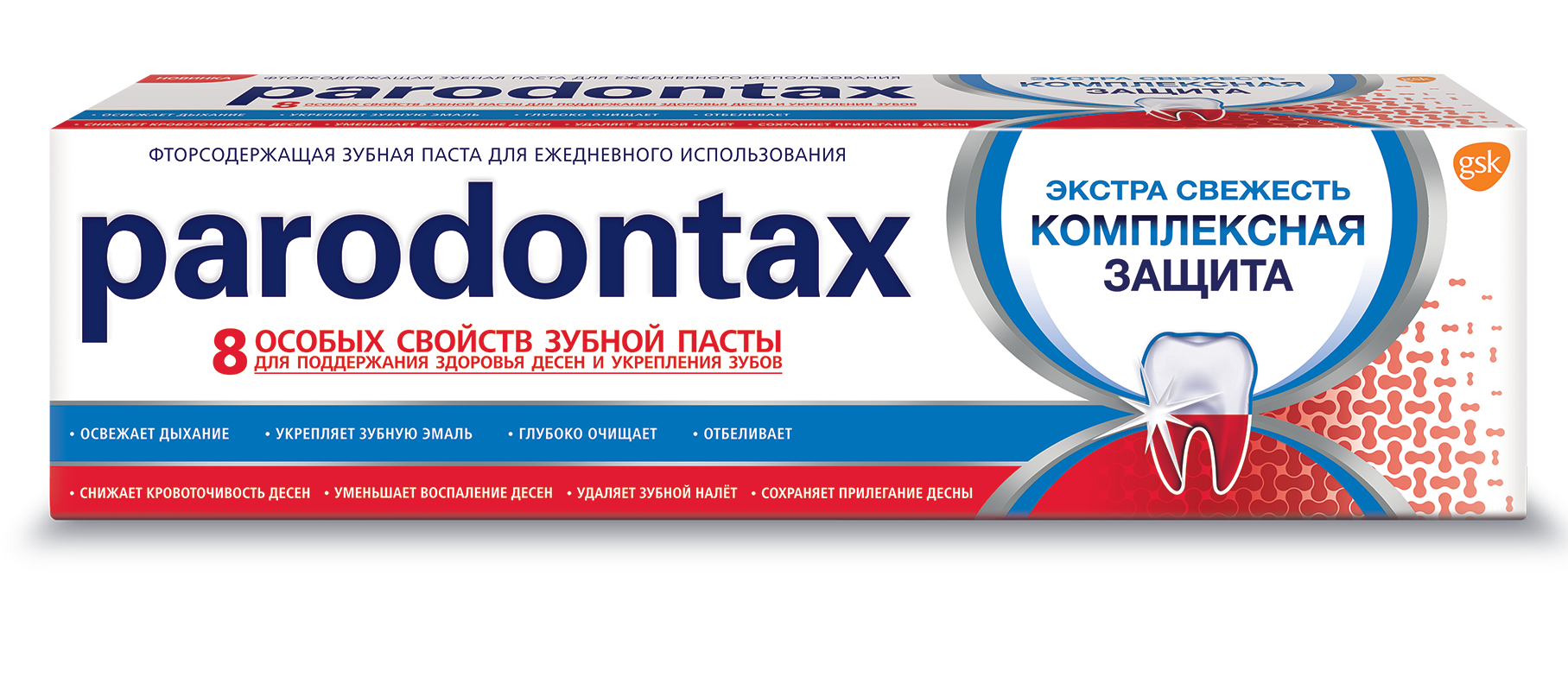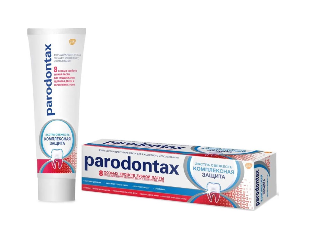 Зубная паста Parodontax Комплексная Защита обладает 8 особыми свойствами для поддержания здоровья десен и укрепления зубов: