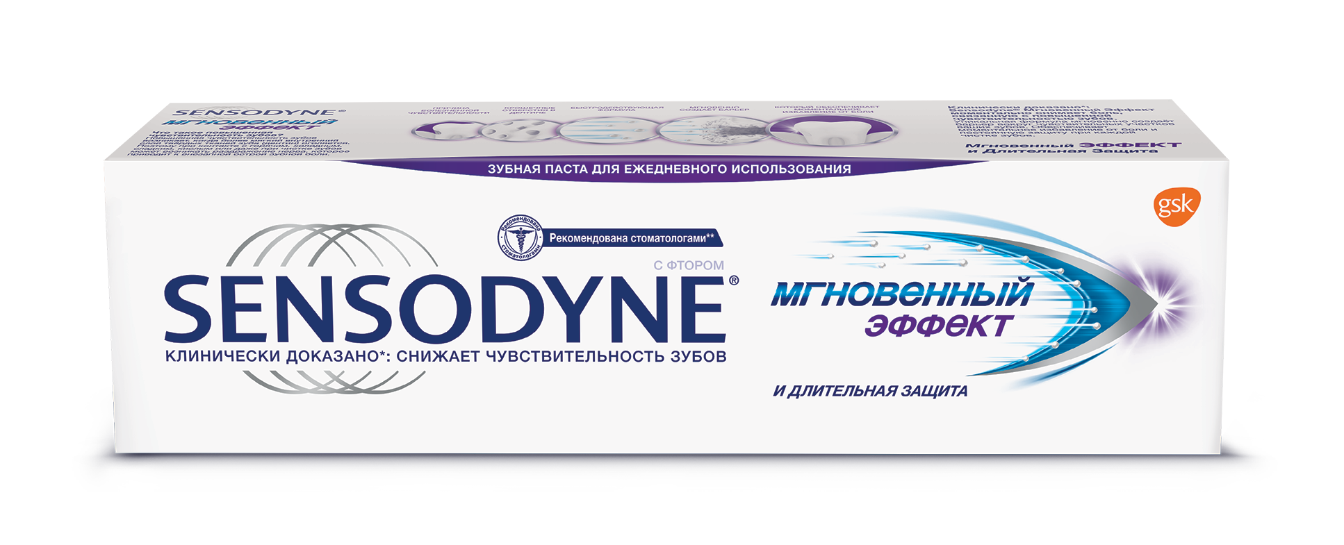 Sensodyne - бренд №1 по рекомендации* стоматологов для чувствительных зубов. Зубная паста Sensodyne Мгновенный Эффект способствует снижению чувствительности зубов через 60 секунд** после нанесения, обеспечивает мгновенное и продолжительное снижение боли при гиперчувствительности зубов, а также создает изолирующий слой на поверхности дентина и внутри дентинных канальцев. При чистке зубов 2 раза в день паста Sensodyne Мгновенный Эффект также защищает от кариеса благодаря содержанию фтора.