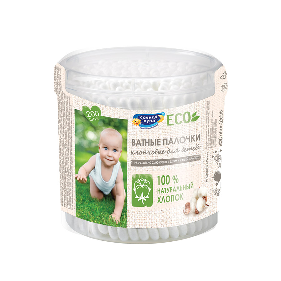СОЛНЦЕ И ЛУНА ЕСО Ватные палочки для детей стакан круглый 200шт