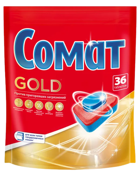 Таблетки для посудомоечной машины Сомат Голд - это лучшая формула Сомат для глубокого очищения! Сомат Голд - наш №1 в линейке Сомат против пригоревших загрязнений! Таблетки Сомат голд расщепляют остатки пищи и удаляют самые трудные загрязнения, обеспечивая ослепительную чистоту посуды.