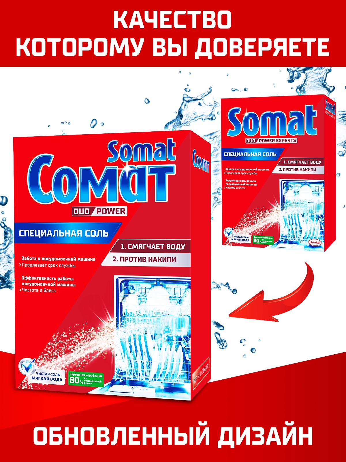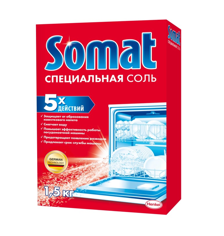 Специальная соль для посудомоечной машины Somat смягчает воду, предотвращая образование известкового налета на разбрызгивателях и сливной трубе, тем самым соль для посудомойки продлевает срок службы Вашей посудомоечной машины. Откройте для себя 5 активных действий специальной соли для посудомоечной машины Somat: - Защищает от образования известкового налёта - Смягчает воду - Повышает эффективность работы посудомоечной машины - Соль для посудомойки предотвращает появление разводов - Продлевает срок службы посудомоечной машины. Бренд Сомат разработал полный комплекс средств для посудомоечной машины, чтобы посуда сверкала чистотой, а техника служила долго и надежно.