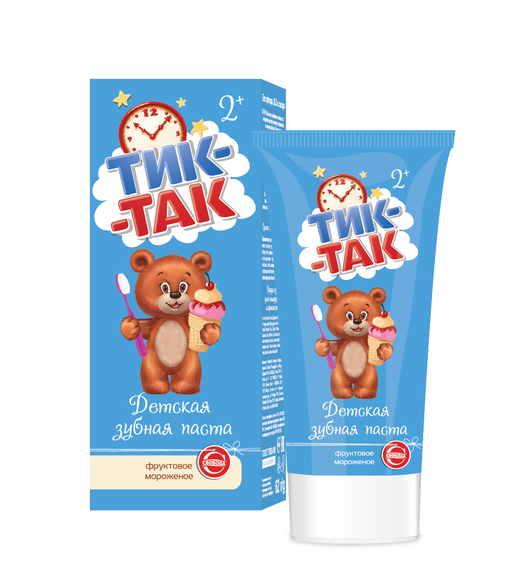 Особая мягкая очищающая система зубной пасты «Тик-Так» с ароматом клубники позволяет бережно ухаживать за полостью рта ребёнка, не повреждая структуру эмали молочных и первых постоянных зубов.