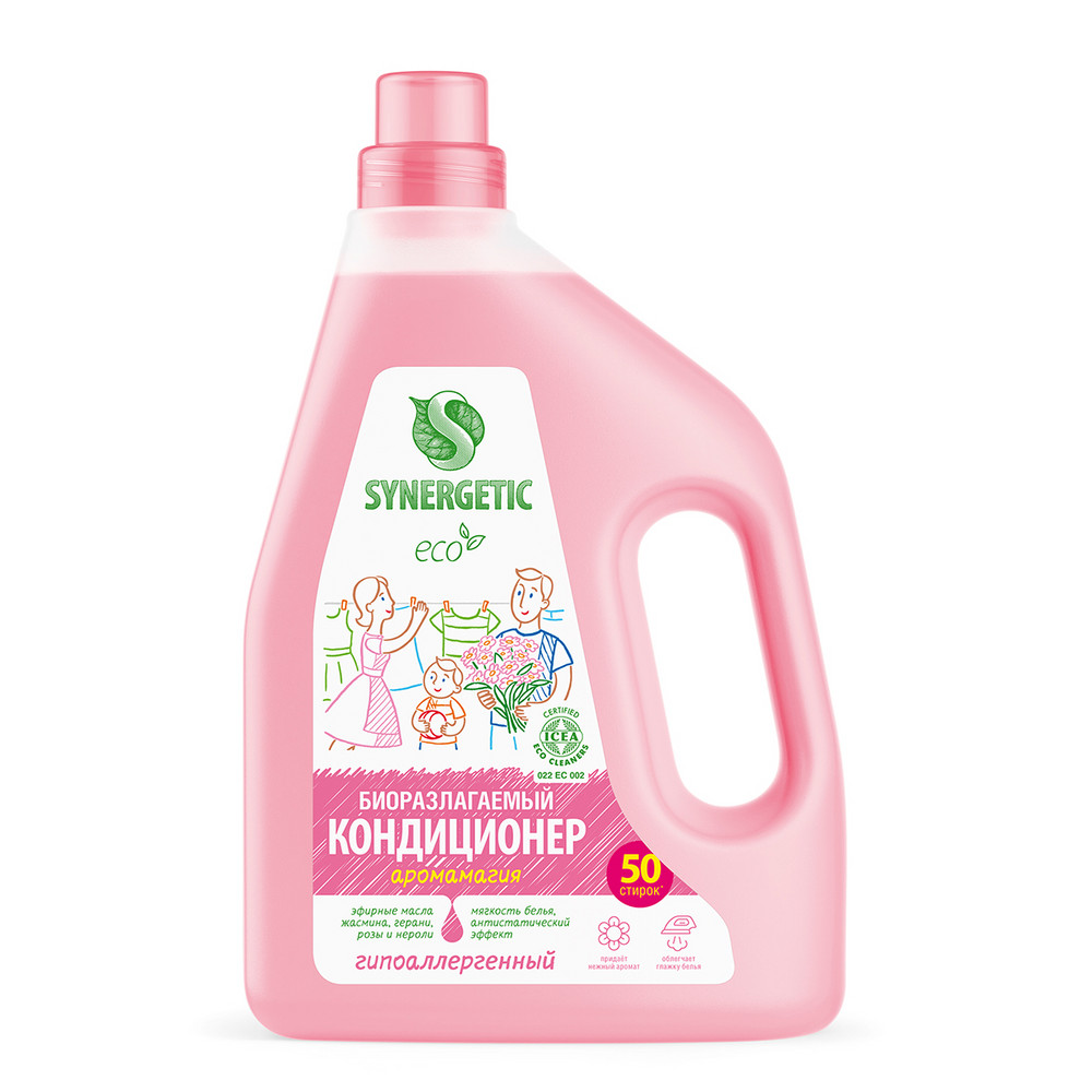 Биоразлагаемый кондиционер-ополаскиватель для белья SYNERGETIC "Аромамагия" – высокоэффективное средство, бережно ухаживающее за всеми типами ткани, в том числе деликатными, и придающее особую мягкость и нежность белью после стирки. Гипоаллергенный кондиционер-ополаскиватель нейтрализует остатки средств для стирки на ткани, помогает сохранить структуру ткани, защищая волокна от изнашивания и повреждения. Средство обладает антистатическим эффектом. Комплекс растительных К-тензидов обеспечивает легкую глажку белья после стирки и высыхания. Гипоаллергенная парфюмерная композиция с эфирными маслами жасмина, герани, розы и нероли придает белью нежный и приятный аромат. Подходит для ручной и машинной стирки, полностью выполаскивается из тканей. Международный экологический сертификат ICEA подтверждает биоразлагаемость, безопасность и эффективность средства.