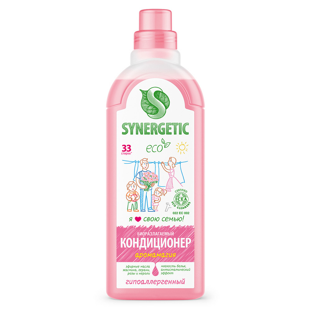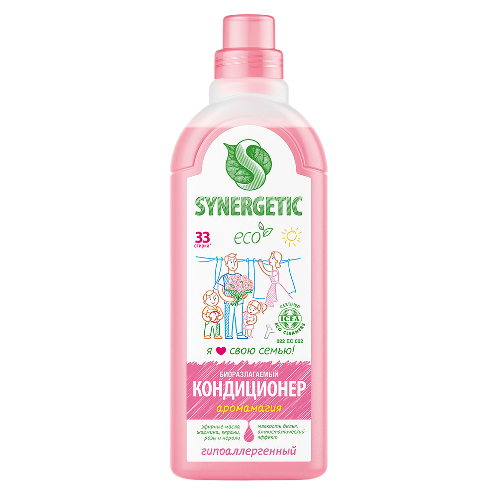 Биоразлагаемый кондиционер-ополаскиватель для белья SYNERGETIC "Аромамагия" – высокоэффективное средство, бережно ухаживающее за всеми типами ткани, в том числе деликатными, и придающее особую мягкость и нежность белью после стирки. Гипоаллергенный кондиционер-ополаскиватель нейтрализует остатки средств для стирки на ткани, помогает сохранить структуру ткани, защищая волокна от изнашивания и повреждения. Средство обладает антистатическим эффектом. Комплекс растительных К-тензидов обеспечивает легкую глажку белья после стирки и высыхания. Гипоаллергенная парфюмерная композиция с эфирными маслами жасмина, герани, розы и нероли придает белью нежный и приятный аромат. Подходит для ручной и машинной стирки, полностью выполаскивается из тканей. Международный экологический сертификат ICEA подтверждает биоразлагаемость, безопасность и эффективность средства.