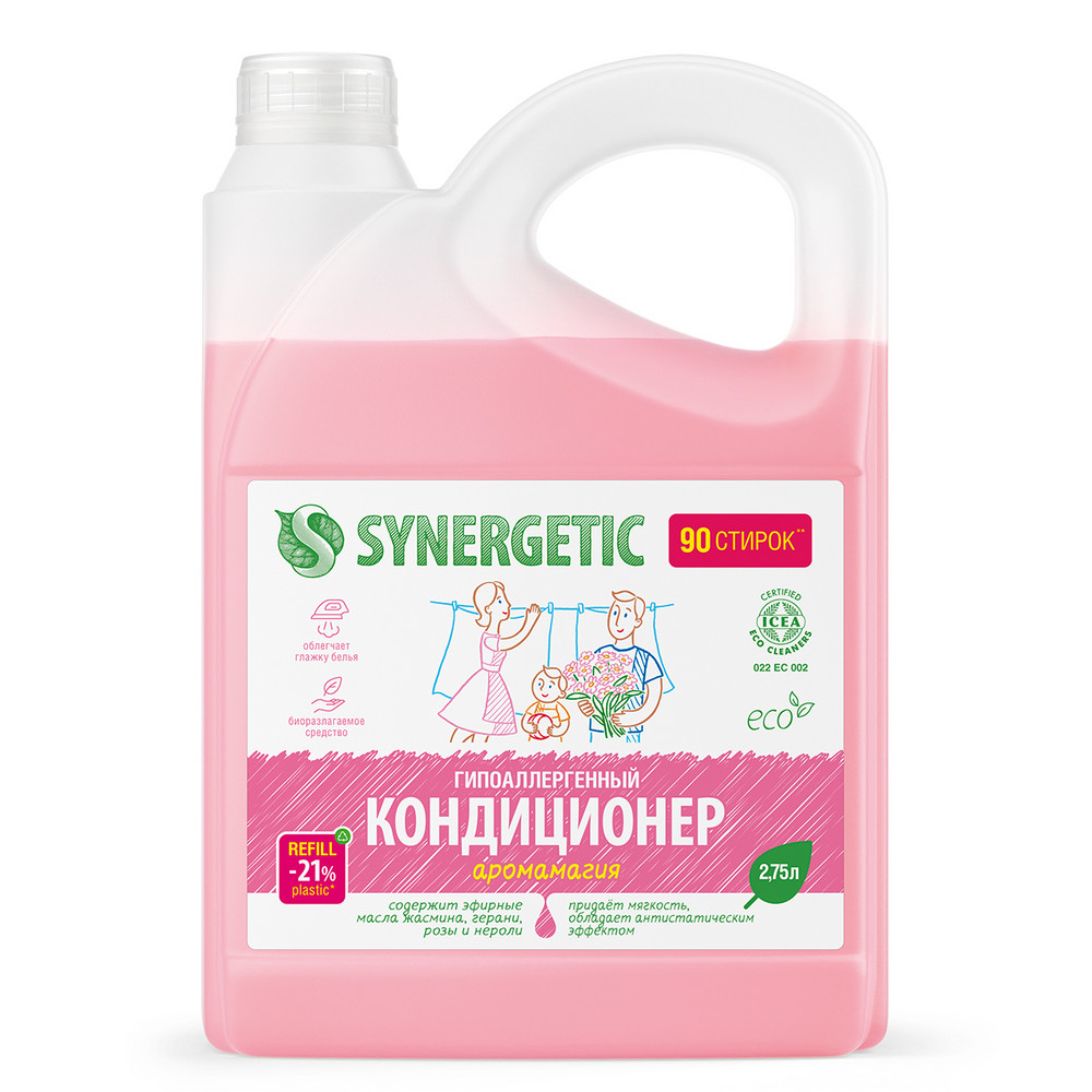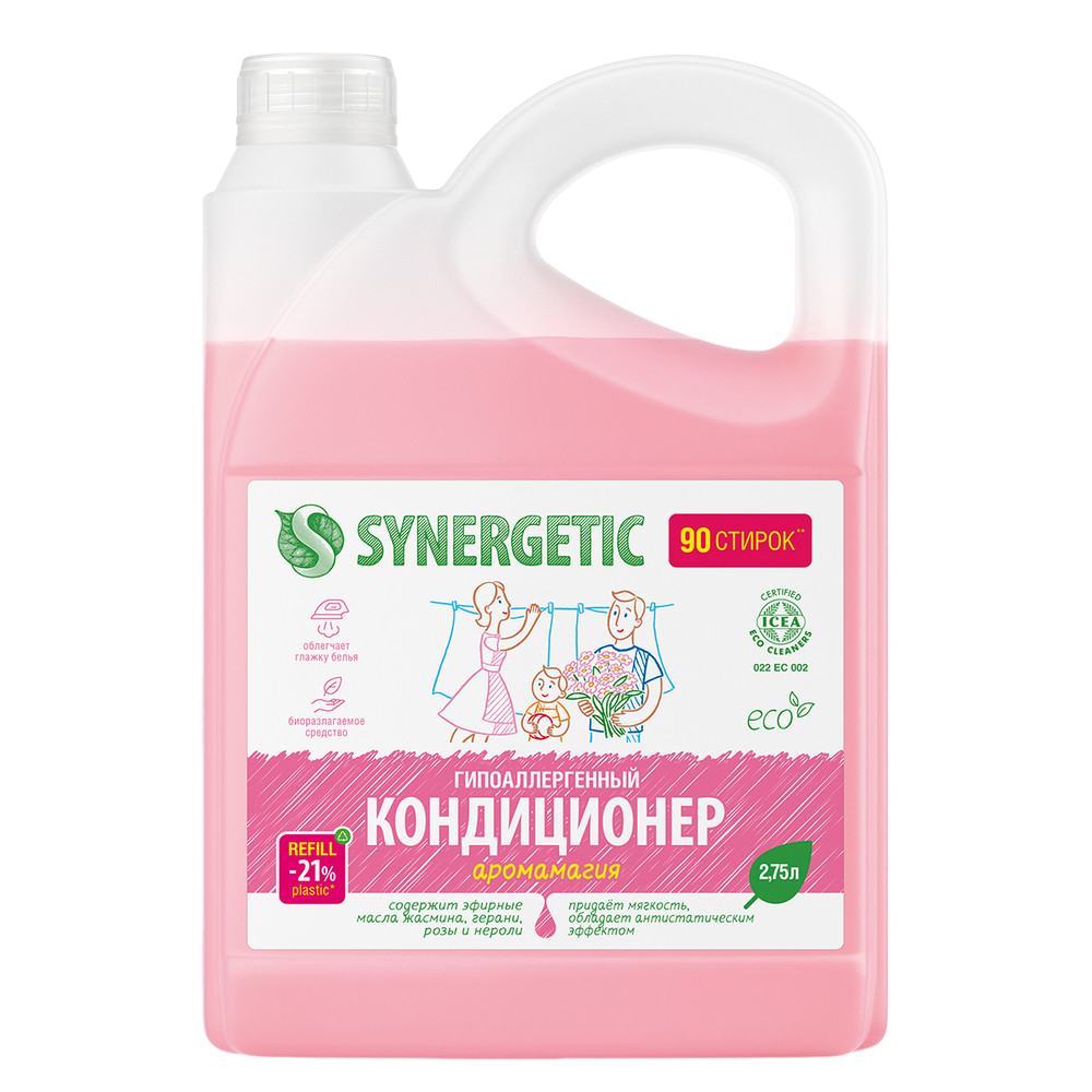 Биоразлагаемый кондиционер-ополаскиватель для белья SYNERGETIC "Аромамагия" – высокоэффективное средство, бережно ухаживающее за всеми типами ткани, в том числе деликатными, и придающее особую мягкость и нежность белью после стирки. Гипоаллергенный кондиционер-ополаскиватель нейтрализует остатки средств для стирки на ткани, помогает сохранить структуру ткани, защищая волокна от изнашивания и повреждения. Средство обладает антистатическим эффектом. Комплекс растительных К-тензидов обеспечивает легкую глажку белья после стирки и высыхания. Гипоаллергенная парфюмерная композиция с эфирными маслами жасмина, герани, розы и нероли придает белью нежный и приятный аромат. Подходит для ручной и машинной стирки, полностью выполаскивается из тканей. Международный экологический сертификат ICEA подтверждает биоразлагаемость, безопасность и эффективность средства.