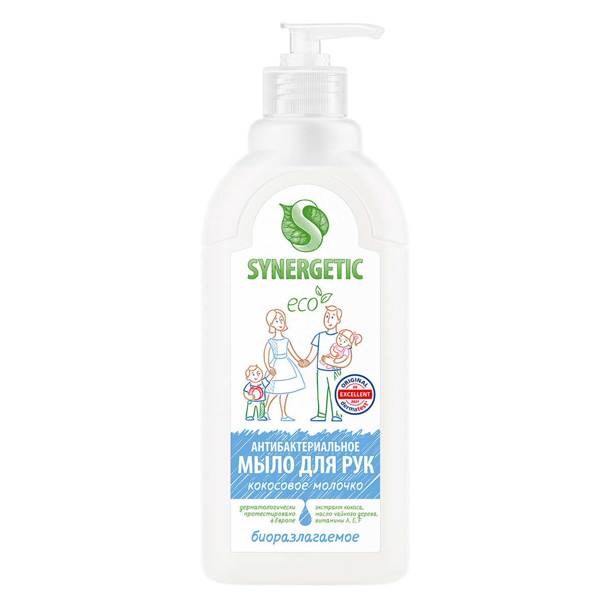 Антибактериальное увлажняющее жидкое крем-мыло SYNERGETIC "Кокосовое молочко" эффективно очищает кожу от любых загрязнений и запахов даже в холодной воде. Комбинация растительных К-тензидов, морской соли и натуральных эфирных масел чайного дерева, эвкалипта и тимьяна обеспечивает длительный антибактериальный эффект с защитой от микроорганизмов на 99,9%. Экстракт кокоса и растительный глицерин интенсивно увлажняют кожу. Комплекс витаминов A, E, F повышает сопротивляемость кожи неблагоприятному воздействию внешней среды. Мультифункциональный компонент натурального происхождения софоролипид мягко очищает и сохраняет естественный микробиом кожи. Гипоаллергенное средство подходит для чувствительной кожи. Мыло дерматологически протестировано независимым исследовательским институтом Dermatest®️ в Германии.
