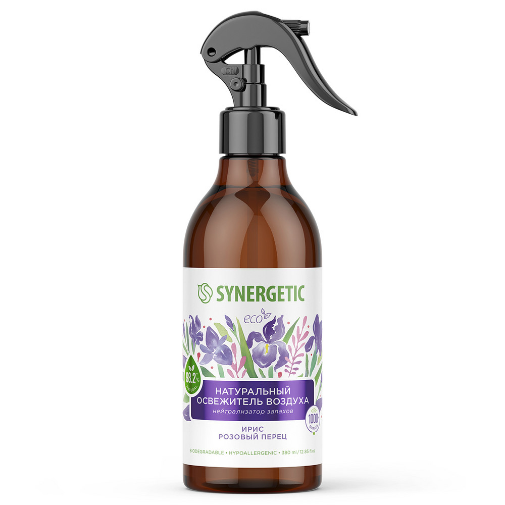 Биоразлагаемый освежитель воздуха, нейтрализатор запахов SYNERGETIC Ирис и розовый перец на водной основе - это безопасная формула с высокой концентрацией натуральных компонентов. Парфюмерная композиция с эфирными маслами герани, розы и ириса наполняет воздух пряным цветочным ароматом. Гипоаллергенная формула безопасна для людей и животных. Благодаря натуральному поглотителю запахов - соли полиитаконовой кислоты - освежитель эффективно устраняет, а не маскирует стойкие запахи от приготовления пищи, домашних животных, табака и других источников неприятных запахов в гостиной, ванной комнате и санузле, спальне, коридоре, кухне, автомобиле, офисе и прочих помещениях.