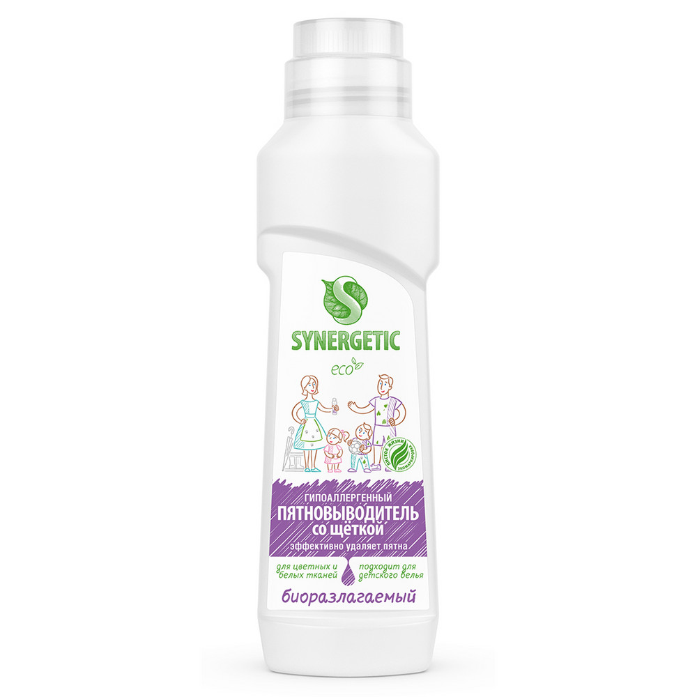 Биоразлагаемый гипоаллергенный пятновыводитель для предварительной обработки пятен SYNERGETIC - универсальное средство для эффективного удаления загрязнений и трудновыводимых пятен с тканей. Комбинация пяти видов энзимов (протеаза, амилаза, липаза, маннаназа, целлюлаза) и растительных ПАВ эффективно удаляет въевшиеся загрязнения и застарелые пятна от масла, жира, какао, ягод, травы, чернил, кофе, вина, крови на белом и цветном белье из натуральных и синтетических тканей. Гипоаллергенный пятновыводитель подходит для детского белья 0+ и одежды людей с чувствительной кожей, а также для деликатных тканей. Средство полностью выполаскивается из волокон и не остается на одежде. Не содержит красителей и ароматизаторов. Биоразлагаемый пятновыводитель безопасен для септических установок. Попадая в среду септика, средство «понятно» для микроорганизмов и без труда распадается на простые соединения. Гипоаллергенный пятновыводитель имеет экомаркировку "Листок жизни".