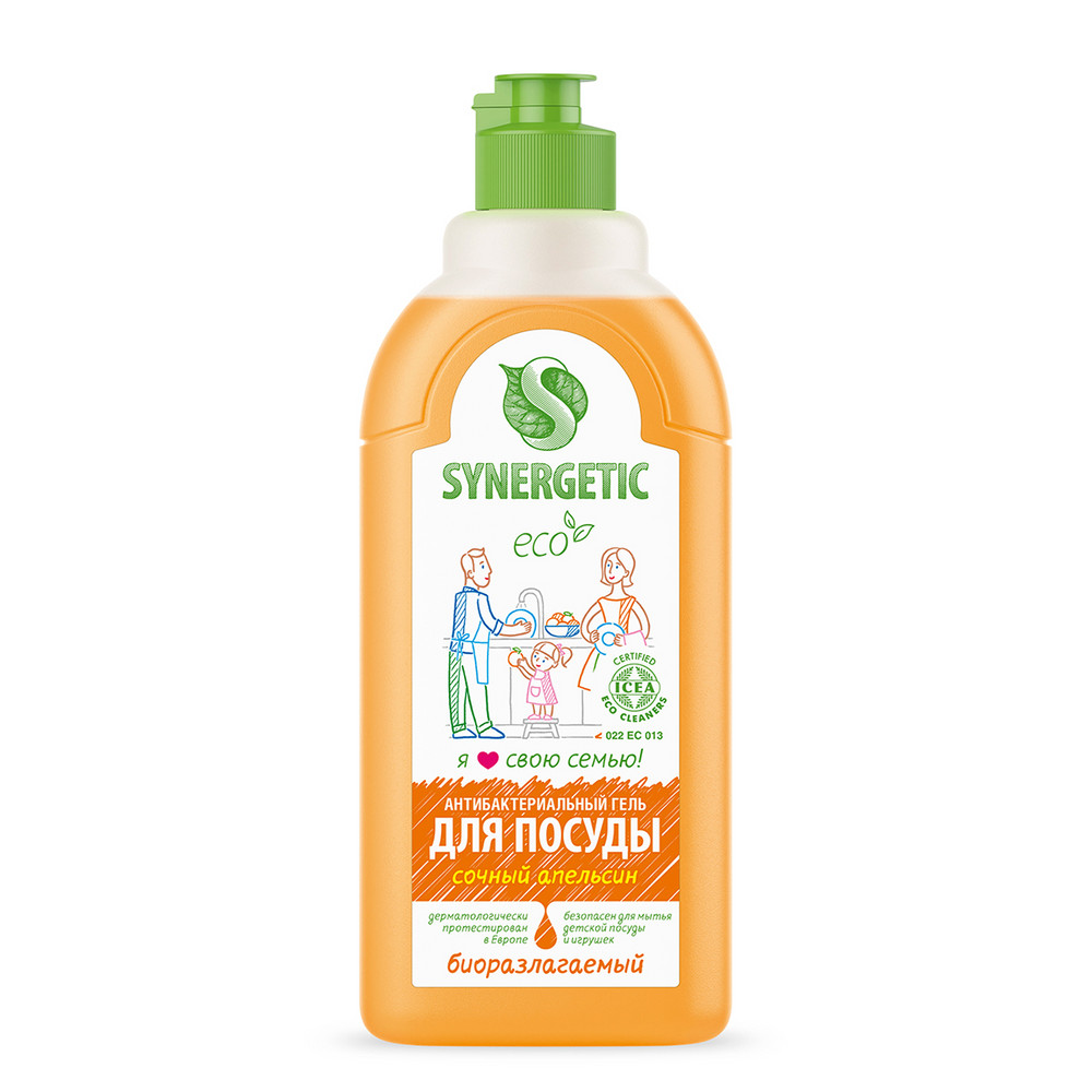 Биоразлагаемый концентрированный гель для посуды с антибактериальным эффектом SYNERGETIC - это экологичное, безопасное и эффективное средство для мытья всех видов посуды, в том числе детской, кухонного инвентаря и детских игрушек от любых видов загрязнений. Он полностью смывается водой и не оставляет следов на посуде. Мягкие биоразлагаемые тензиды из растительного масла обеспечивают хорошее пенообразование и эффективно удаляют жир и запахи даже в холодной воде. Растительный глицерин в составе средства защищает кожу рук от сухости и раздражения. Гипоаллергенная парфюмерная композиция с эфирными маслами апельсина, померанца, петитгрейна, мандарина и бергамота придает средству свежий и приятный аромат. Гипоаллергенный гель дерматологически протестирован в Европе. Международный экологический сертификат ICEA подтверждает биоразлагаемость, безопасность и эффективность средства. Биоразлагаемые компоненты не вредят микрофлоре септических установок.