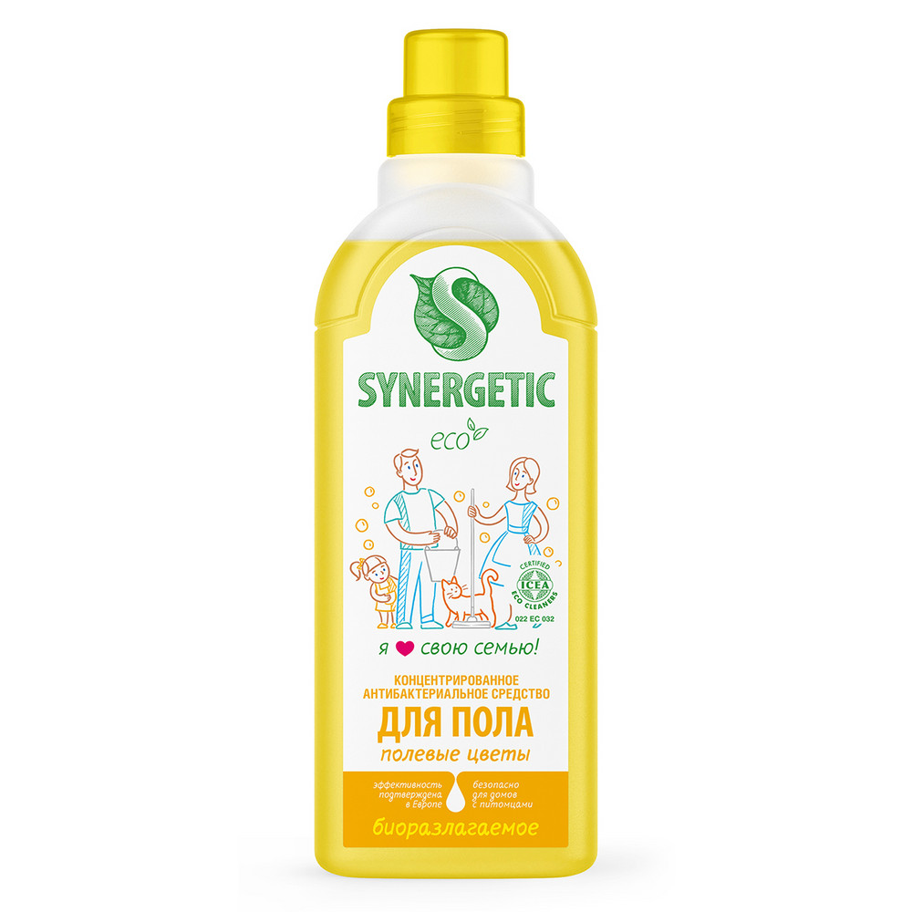 Биоразлагаемое концентрированное средство с антибактериальным эффектом SYNERGETIC "Полевые цветы" - универсальное средство для ежедневной и генеральной уборки пола и других поверхностей: столов, стен, потолка. Уникальный комплекс растительных тензидов эффективно удаляет загрязнения и неприятные запахи даже в холодной воде. Комплекс зеленых хелатов предотвращает повторное оседание загрязнений на поверхности. Подходит для паркета, ламината, плитки, линолеума, металла, стекла, пластика, дерева. Гипоаллергенная парфюмерная композиция на основе эфирных масел ромашки, шалфея, аниса и бергамота оставляет легкий и приятный аромат. Международный экологический сертификат ICEA подтверждает биоразлагаемость, безопасность и эффективность средства. Оно не требует смывания, не оставляет разводов на поверхности, подходит для уборки в детских комнатах и учреждениях, а также безопасно для домов с питомцами.