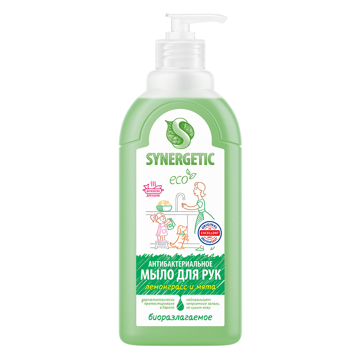 Антибактериальное увлажняющее жидкое мыло SYNERGETIC "Лемонграсс и мята" эффективно очищает кожу от любых загрязнений даже в холодной воде. Особенно эффективно против неприятных запахов. Комбинация растительных К-тензидов, морской соли и натуральных эфирных масел лемонграсса, мяты, чайного дерева, эвкалипта и тимьяна обеспечивает длительный антибактериальный эффект с защитой от микроорганизмов на 99,9%. Растительный глицерин обеспечивает интенсивное увлажнение кожи. Комплекс витаминов A, E, F повышает сопротивляемость кожи неблагоприятному воздействию внешней среды. Мультифункциональный компонент натурального происхождения софоролипид мягко очищает и сохраняет естественный микробиом кожи. Гипоаллергенное средство подходит для чувствительной кожи. Мыло дерматологически протестировано независимым исследовательским институтом Dermatest®️ в Германии. Биоразлагаемые компоненты безопасны для природы и человека и не вредят микрофлоре септических установок.
