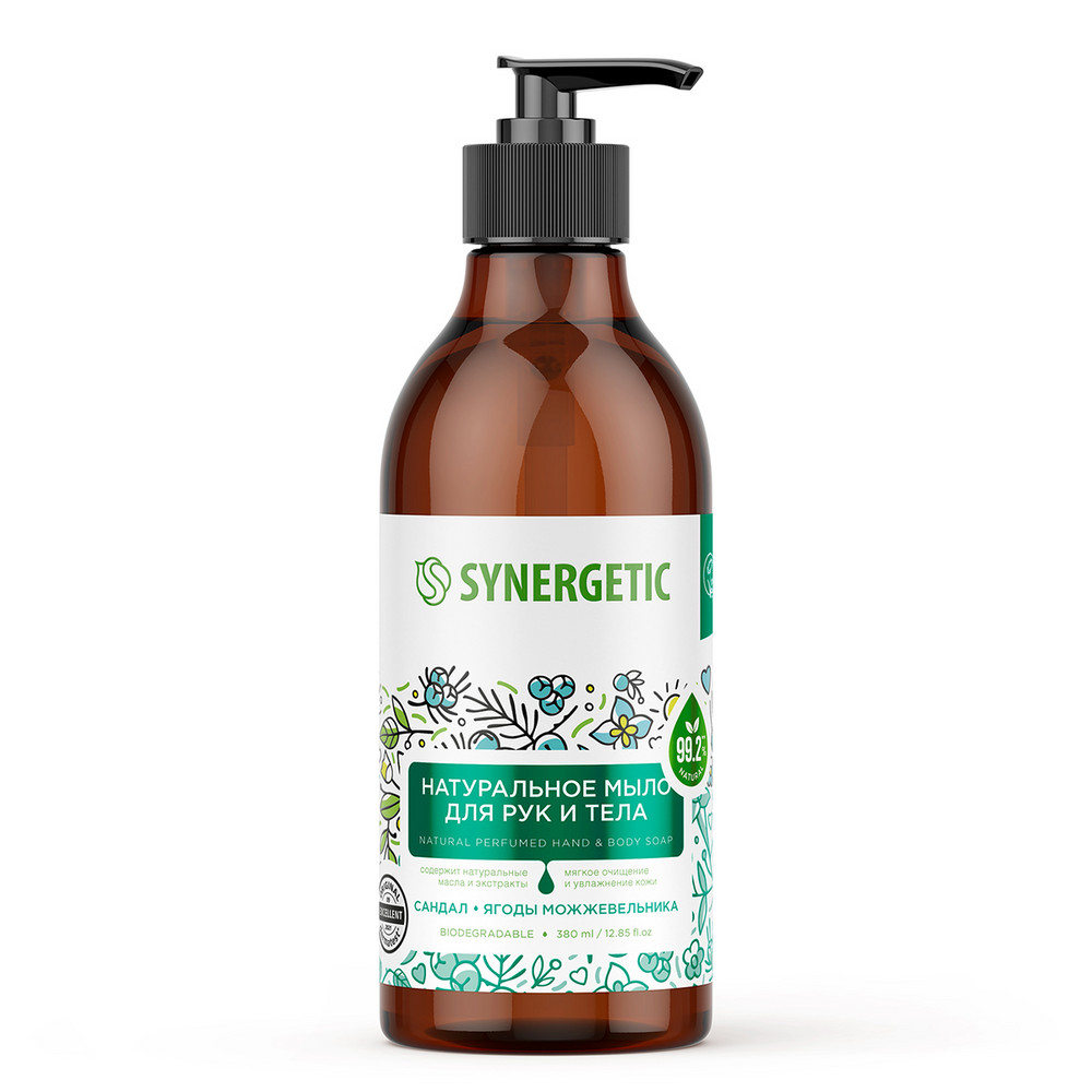 Натуральное биоразлагаемое мыло для рук и тела SYNERGETIC Сандал и ягоды можжевельника - это деликатное средство для очищения кожи, более чем на 99% состоящее из натуральных компонентов. Гипоаллергенный аромат мыла разработан в швейцарском доме Givaudan с использованием натуральных эфирных масел пачули, ладанника, герани, гурьюнского бальзама и розового перца. Масла макадамии и гранатовых косточек восстанавливают, питают и увлажняют кожу, делая её гладкой и бархатистой. Экстракты сандалового дерева и можжевельника увлажняют кожу и оказывают тонизирующий эффект. Софоролипид из рапсового масла мягко очищает и сохраняет естественный микробиом кожи. Уникальный комплекс натуральных компонентов на основе глицерина и растительных сахаров обеспечивает длительный смягчающий эффект до 72 часов.