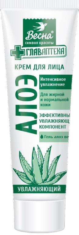 Весна Главаптека Крем для лица, Алоэ 45 мл. Предназначен для ухода за нормальной, жирной кожей. Консистенция легкая в мягкой тубе, запах нежный, косметический, цвет белый, без вкраплений. Входящие в состав экстракт алоэ вера и специально подобранный увлажняющий комплекс тонизируют, способствуют поддержанию в норме воднолипидного баланса. Крем увлажняющий препятствует старению клеток, стимулирует их регенерацию, разглаживает мелкие морщинки, устраняет раздражения, шелушения, активно смягчает, эффективно, сбалансированно питает, успокаивает дерму, возвращает ей естественный цвет. Крем для лица с Алое делает кожу мягкой, увлажненной, бархатистой, напитанной, проходят шелушения. Крем для лица быстро впитывается, не оставляет жирного блеска, ощущения липкости, не забивает поры. Подойдет в качестве основы под макияж.