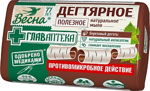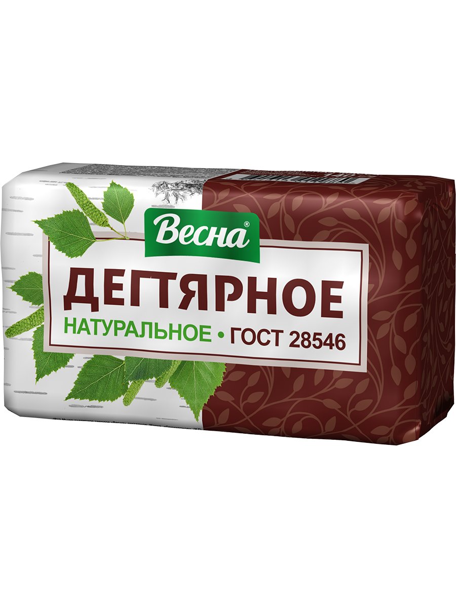 Натуральное мыло для умывания Весна 140г с березовым дегтем предназначено для кожи рук, лица, тела, для ванночек ног. В дегтярном мыле присутствует специфический запах, но он нежный и ненавязчивый. В состав мыла входит важный компонент глицерин, бережно ухаживающий за кожей. Мыло не раздражает кожу и устраняет жирный блеск, мягко очищает кожу, не сушит и не стягивает ее.