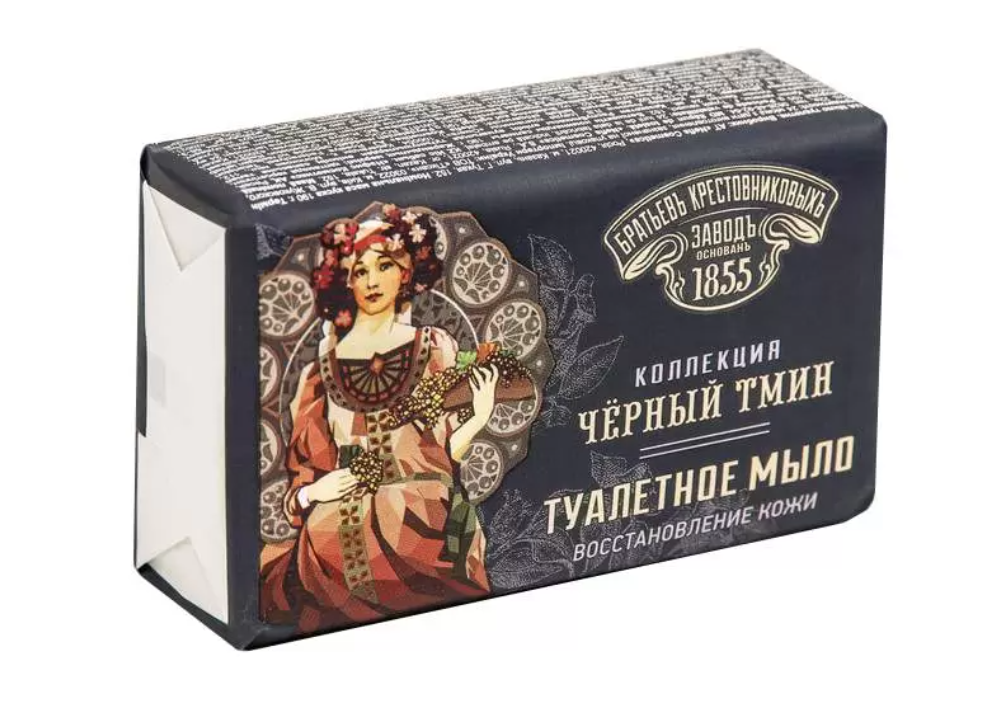 Туалетное Мыло Завод Братьев Крестовниковых Черный Тмин. Кусок мыла создан в объятиях тмина, известным своими косметическими свойствами еще со времен античности. Он замедляет процесс старения кожи, а также возвращает ей здоровый вид .